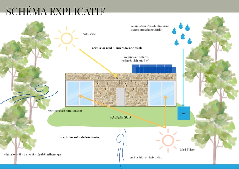 C’était la première fois que je réalisais un projet intégrant une approche bioclimatique, avec pour objectif de concevoir un bâtiment économe en énergie et respectueux de son environnement, en s’appuyant sur les ressources naturelles du site : soleil, vent, végétation et eau.