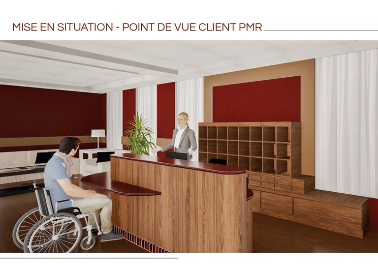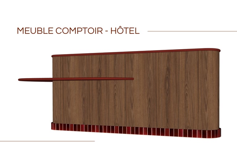 L’objectif était de créer un meuble à la fois fonctionnel, esthétique et accessible, en intégrant notamment une partie adaptée aux personnes à mobilité réduite (PMR). Le projet s’articule autour de plusieurs modules de rangement et d’un plateau principal aux lignes courbes, apportant douceur et fluidité à l’espace d’accueil.