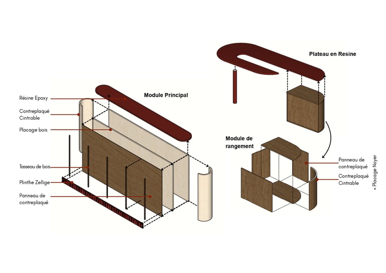 Le choix des matériaux participe également à l’identité du meuble : placage bois, contreplaqué cintrable, résine époxy pour le plateau, et une plinthe en zellige qui vient apporter une touche de caractère et de texture.
