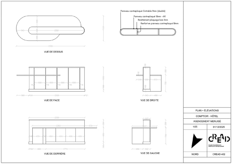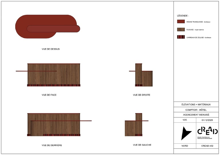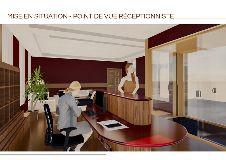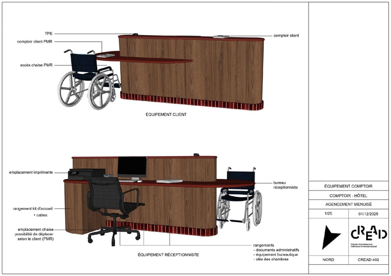 J’ai travaillé sur la conception d’un comptoir de réception pour un hôtel, pensé à la fois pour l’accueil des clients et pour le confort de travail du réceptionniste.