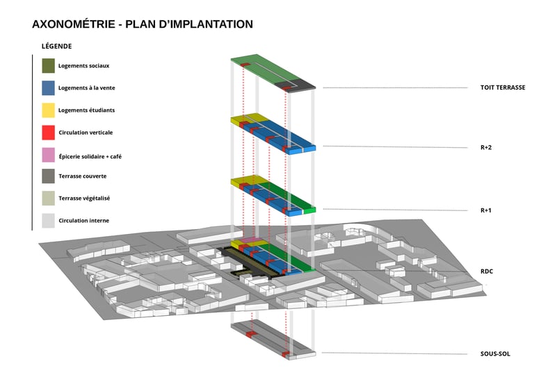 Le projet consiste en la conception d'un bâtiment R+2 intégrant différents types d'habitat afin de favoriser la mixité : logements sociaux, habitat étudiant partagé et logements mis à la vente.