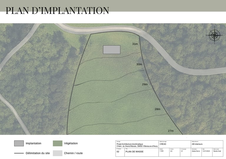 Le projet se situe au nord du lac du Héron à Villeneuve-d’Ascq, dans un environnement naturel composé de prairies, de boisements et de plans d’eau. L’implantation du bâtiment a été réfléchie afin de profiter des apports solaires au sud, tout en se protégeant des vents dominants venant de l’ouest et du nord-ouest.